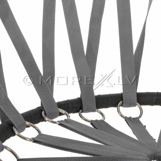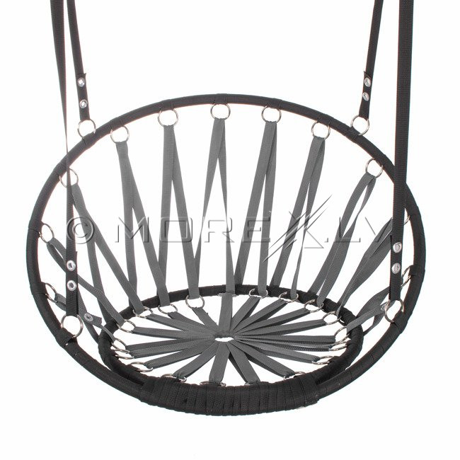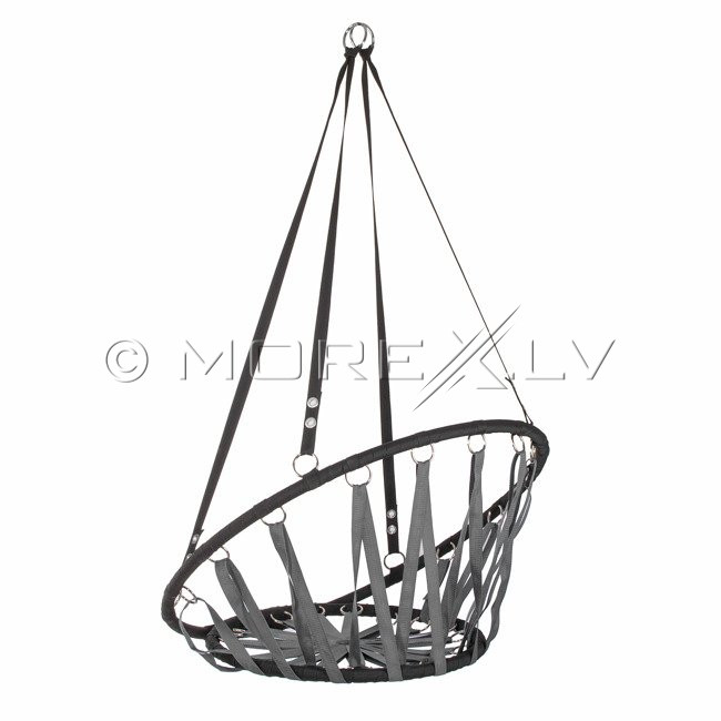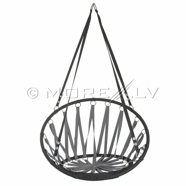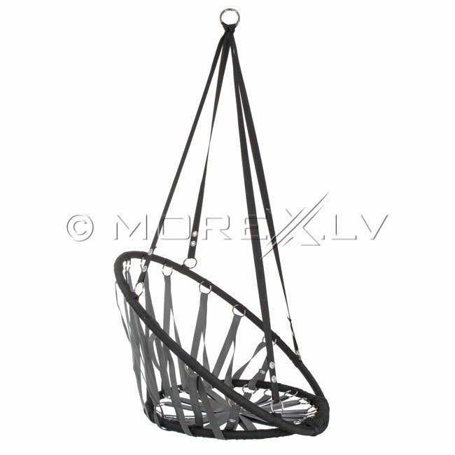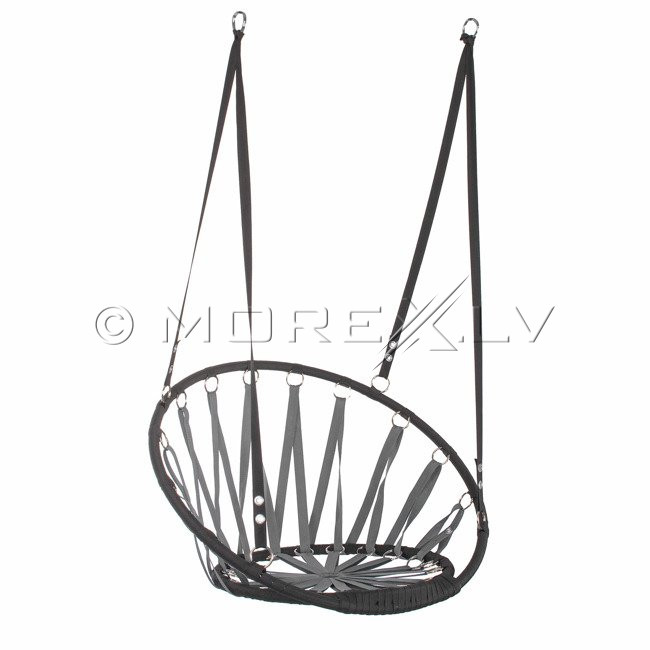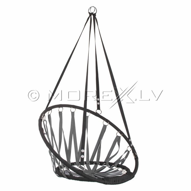 Rāmji no blīva materiāla un grafīta krāsas lentes ir savienoti ar metāla gredzeniem. Izturīgas plakanas virves ir nostiprinātas ar kniedēm. Šāds piekaramais krēsls bez statīva noteikti iepatiksies gan bērniem, gan pieaugušajiem. Šūpoles organiski papildina bērnu istabu, dārza lapeni un studijas tipa dzīvokli.