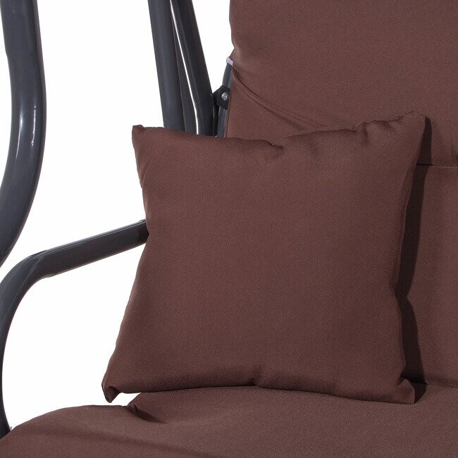 Bagātīgas šokolādes krāsas dārza šūpoles 4 cilvēkiem aicinās doties dārzā ar tasi kafijas vai tējas. Komfortabli plauktiņi ar glāžu turētājiem šūpoļu sānos padarīs tējas dzeršanu ērtāku. Pat lietus nav šķērslis, jo ūdensizturīgais jumtiņš droši aizsargā pret sliktiem laika apstākļiem. Uz plašā sēdekļa var viegli izvietoties neliela ģimene vai draugu kompānija.