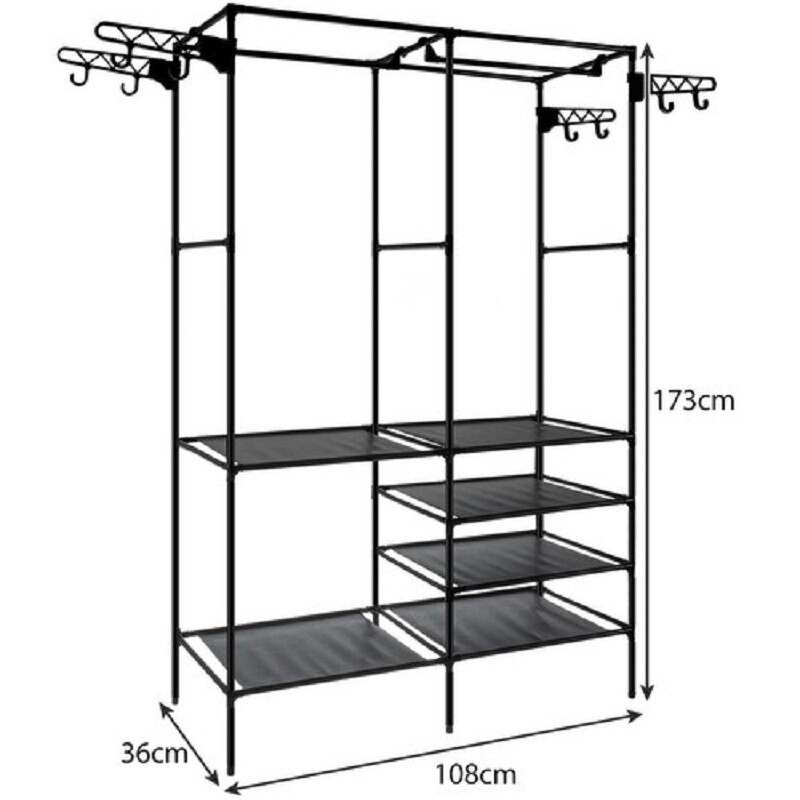The hanger is a perfect solution for those who have limited space or a temporary piece of furniture at home. The hanger is light and adaptable to various rooms. It has 6 shelves, 2 hanging bars and 8 hangers.