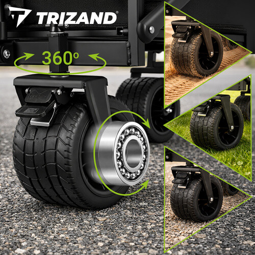- Wheel features: Wide, with tread, 360° rotating front wheels