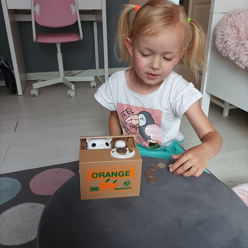 How does it work? The principle is very simple: the child places a coin on a special pad, the kitten responds to the pressure, pops out of the box, and pulls the coin inside with its paw. This process is so much fun that the child will happily want to add more and more coins!