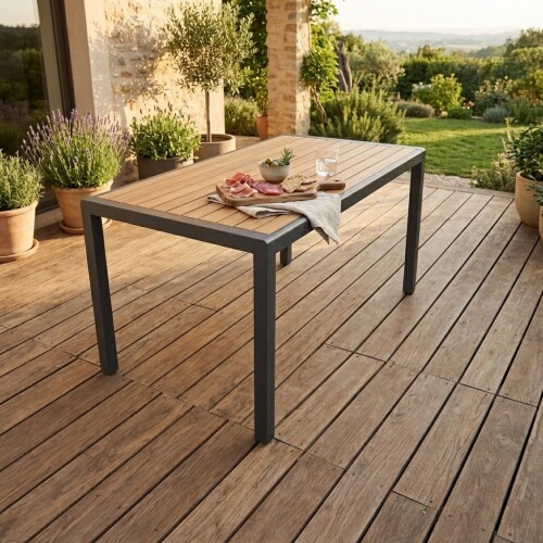 This dining table is the epitome of flawless style and practicality for outdoor living. The combination of a noble wood texture and a durable aluminum frame creates a cozy atmosphere, while modern polymer materials eliminate the need for annual maintenance, painting, or moisture protection. It withstands both scorching sun and heavy rain, maintaining its pristine appearance for years. Thanks to its versatility and lightweight design, the table fits perfectly onto an open terrace, becomes the centerpiece for family dinners in a shady garden, or enhances a poolside lounge area, turning any outdoor space into a comfortable living environment.