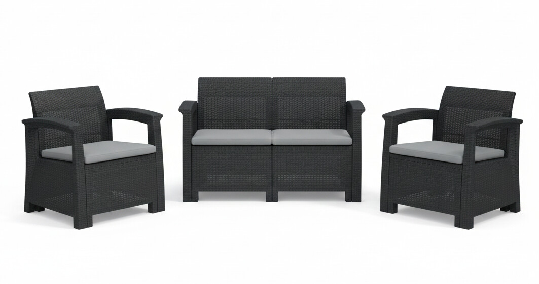 Each chair and sofa is equipped with soft, thick seat cushions that guarantee maximum comfort during extended relaxation. Clean lines and high-quality rattan weaving give the set a modern yet cozy look, easily fitting into any landscape design.