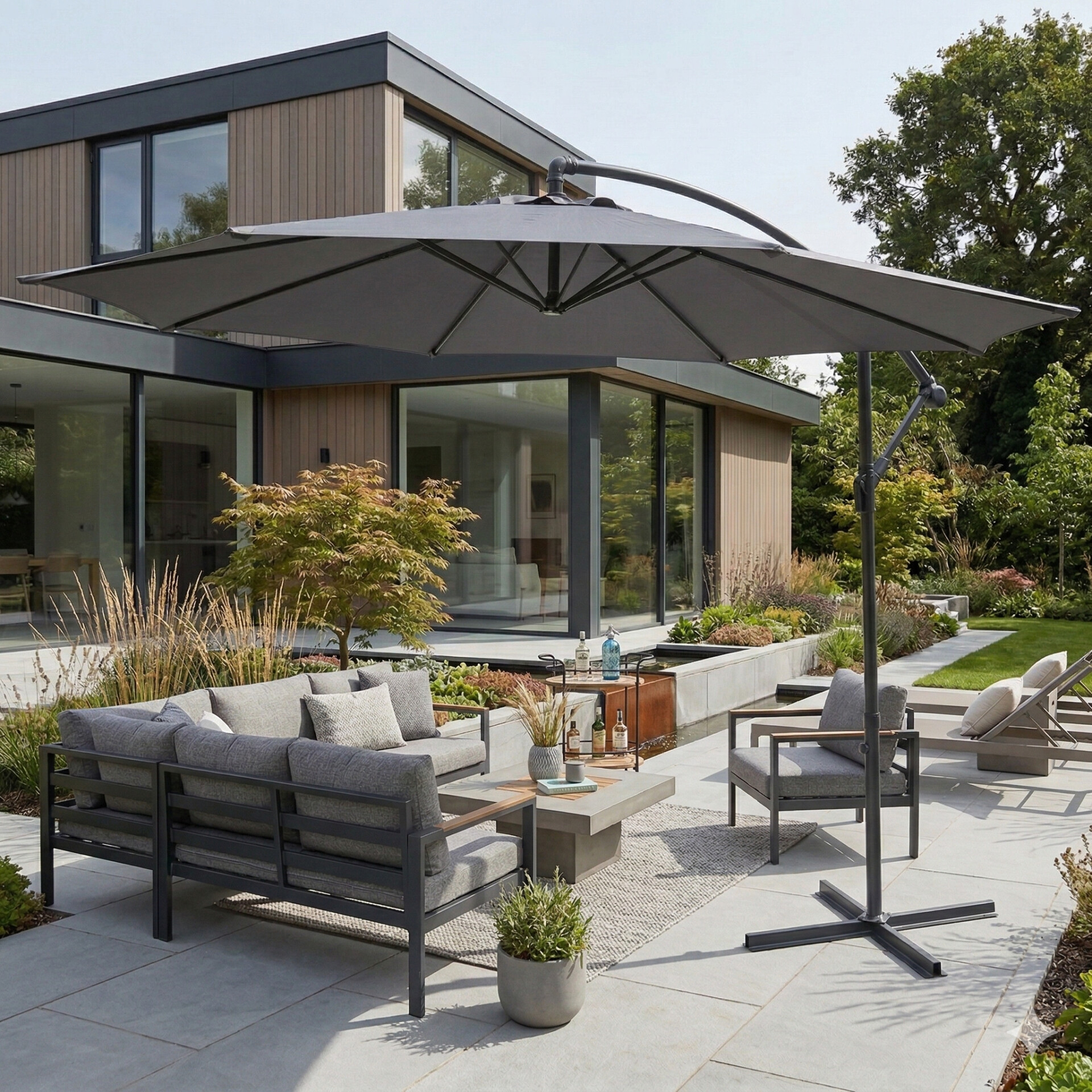 This modern and functional hanging garden umbrella is the ideal solution for creating pleasant shade on your terrace or in your garden. Its "banana" type design allows you to use the space under the umbrella freely, as the pole is located on the side rather than the center.