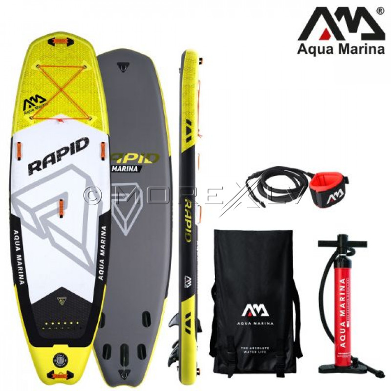 Sup board Rapid 9’6″ is one of the few in the Aqua Marina model line, designed for rough waters. This paddle board is mostly for experienced riders. Its stability is provided with the help of four additional non-removable fins. The fish tail of the paddle board makes this model ideal for high waves.
