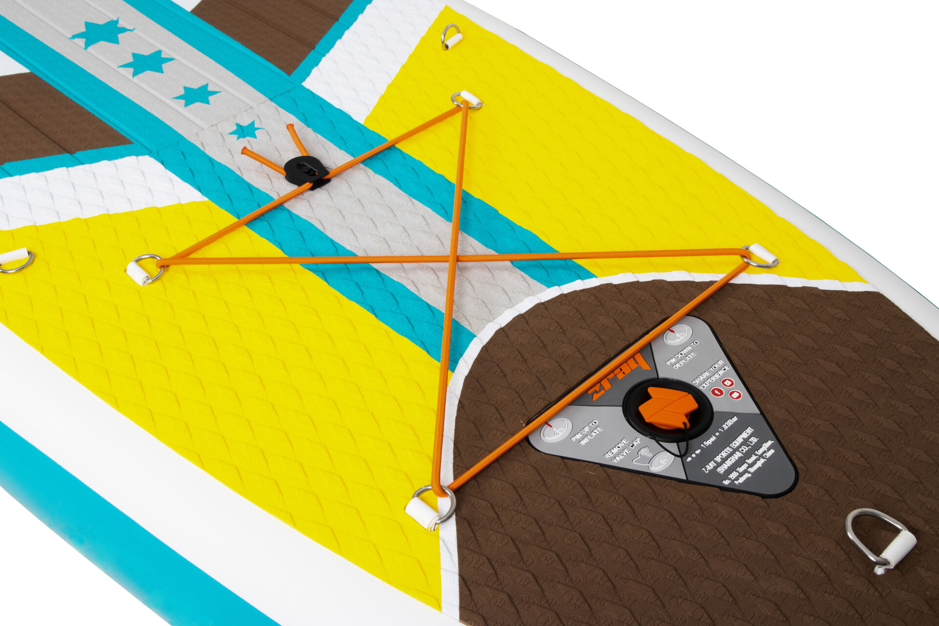 - Drop Stitch Technology: an internal structure of thousands of nylon threads allows the board to hold its shape and provide high stiffness comparable to hard boards.