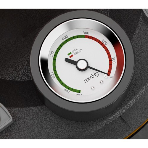 - Integrated pressure gauge: The device is equipped with a suction power indicator showing pressure up to 760 mmHg. When the needle is in the green zone, the suction force is at its maximum, and work is safe.