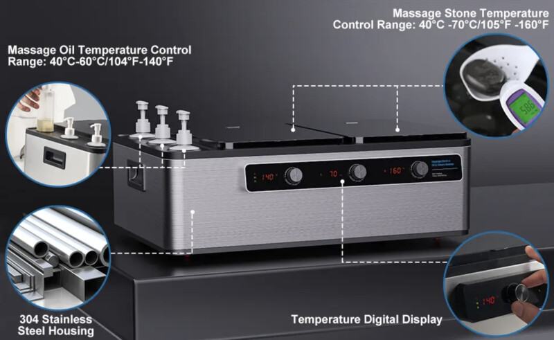 - Masāžas eļļas sildīšanas zona ir aprīkota ar trim 50W sildīšanas caurulēm, savukārt masāžas akmeņu sildīšanas zona ir aprīkota ar divām 500W sildīšanas plāksnēm, kas dod iespēju patstāvīgi kontrolēt un regulēt masāžas eļļas/krēma/losjona un karsto akmeņu sildīšanu. Šis novatoriskais masāžas eļļas sildītāja un karsto akmeņu dizains ļauj ne tikai efektīvi kontrolēt zonas, bet arī palīdz ietaupīt enerģiju.