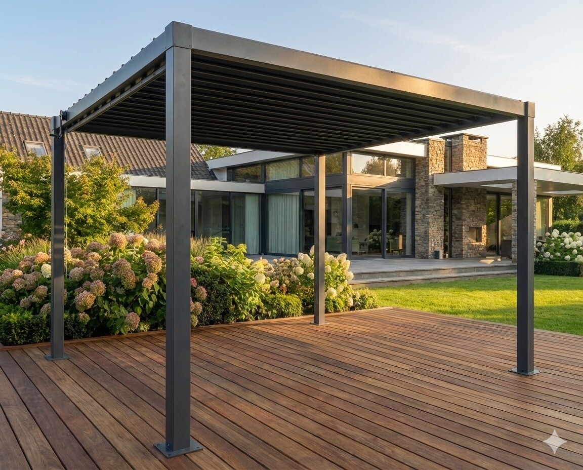 Наслаждайтесь отдыхом на свежем воздухе независимо от капризов погоды! Эта современная пергола — идеальное сочетание долговечности и премиального дизайна. Главное преимущество данной модели — крыша из оцинкованной стали, которая обеспечивает непревзойденную защиту от дождя, снега и палящего солнца. В отличие от стандартных тентов, стальная конструкция рассчитана на многолетнюю эксплуатацию в самых разных климатических условиях.