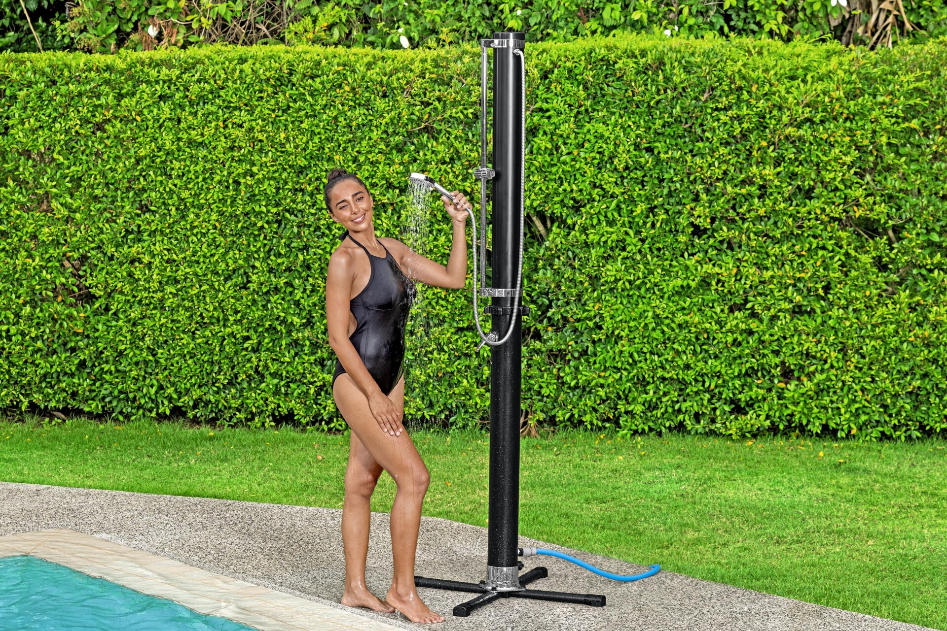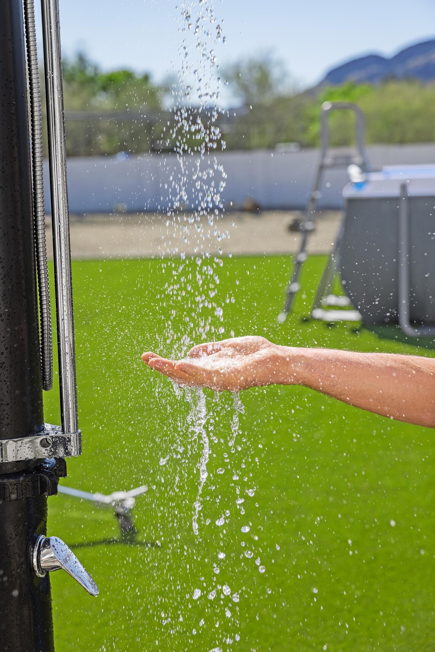 Ополоснитесь под уличным душем Flowclear™ SolarFlow™ , прежде чем возвращаться домой. Идеально подходит для владельцев бассейнов, любителей активного отдыха, игроков в пляжный волейбол и всех, кто хочет принимать душ после активного отдыха. Этот удобный уличный душ оснащен регулируемой душевой насадкой с несколькими настройками распыления, которая может наклоняться, двигаться вверх и вниз, фиксироваться над головой или держаться в руке. Прикрепите душ к прилагаемому основанию для устойчивости и ставьте его каждый раз там, где вам нужно, либо установите его непосредственно на террасу или патио, просверлив отверстия в основании. Подсоедините его к стандартному садовому шлангу (шланг не входит в комплект) с помощью одного из быстроразъемных соединителей и используйте простую ручку-регулятор для получения нужного расхода и температуры, чтобы получить идеальный душ. Хотите теплый или горячий душ в следующий раз? Оставьте воду в резервуаре душа и дайте солнцу нагреть ее.