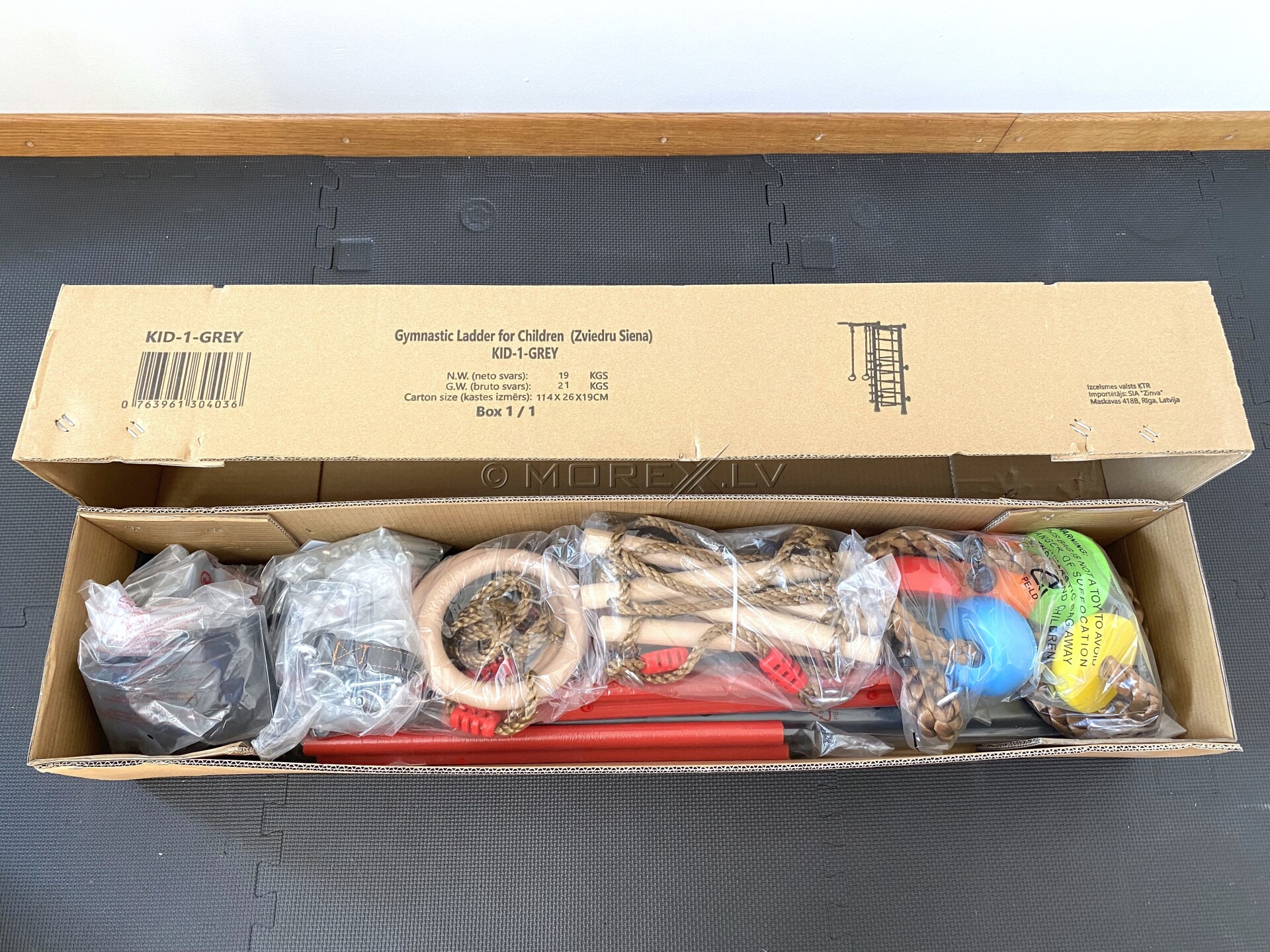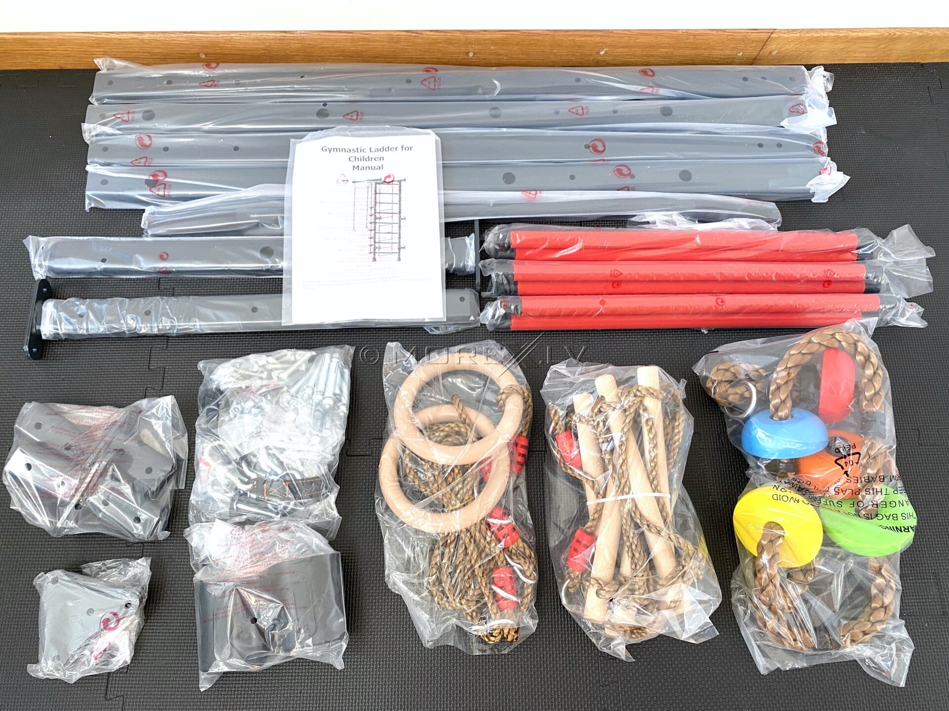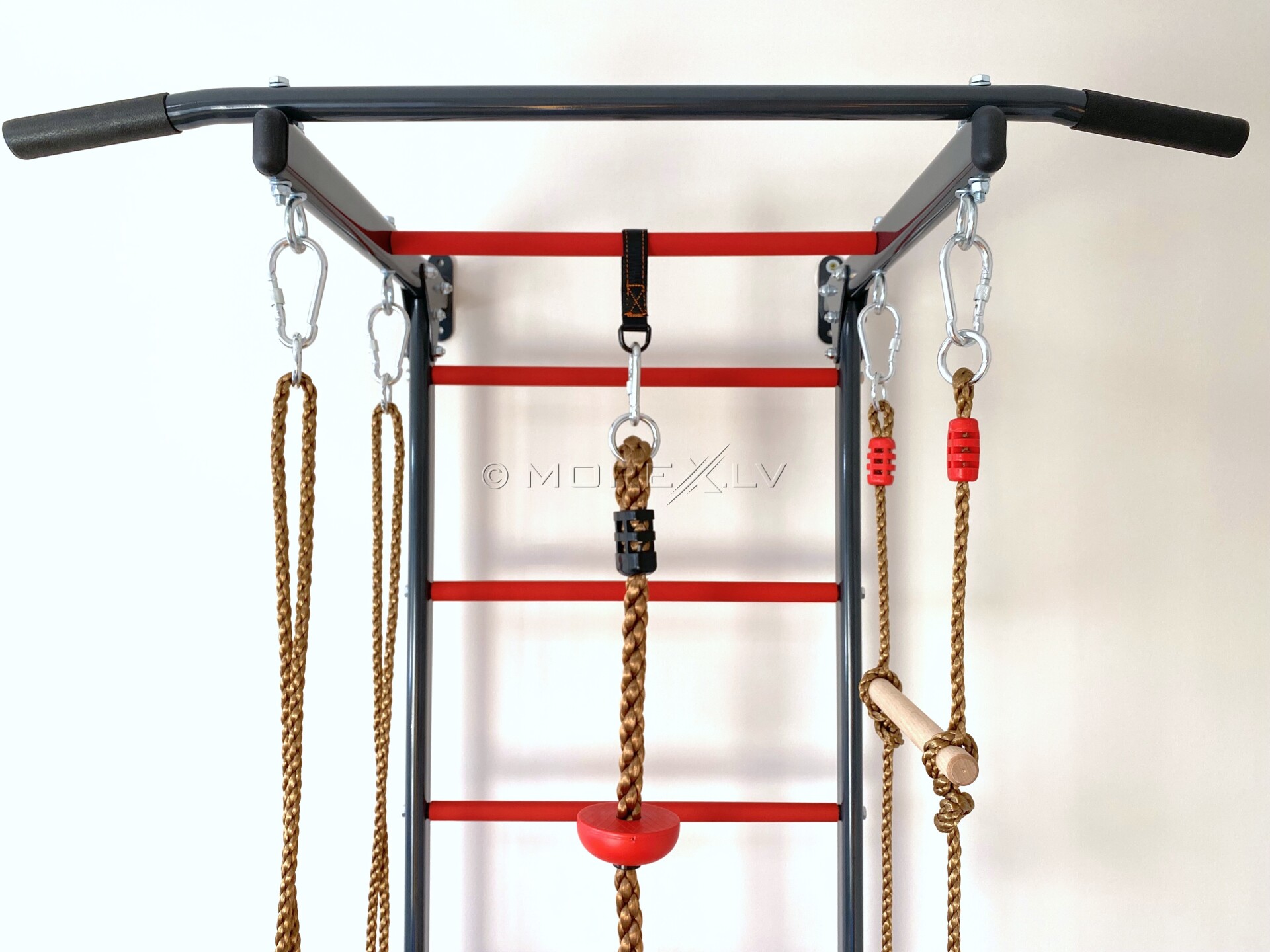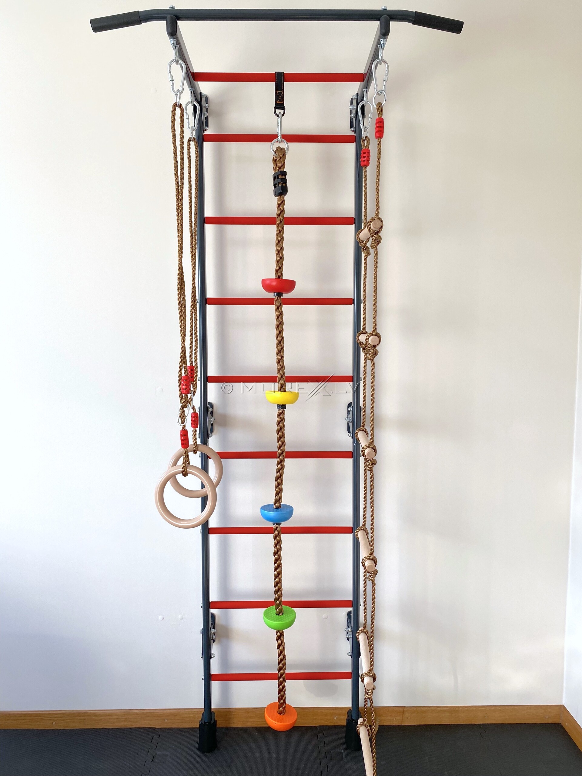 RESTPRO® KID-1 функциональная шведская стенка, крепится приложенными анкерными болтами к стене. У Шведской стенки есть не только турник, но и дополнительное оборудование: веревочная лестница, кольца и канат. Ступеньки шведской стенки имеют мягкое ПВХ покрытие, что приятно на ошупь маленьким ручкам и не позволит детской ножке соскользнуть. Максимальная нагрузка 100 кг.