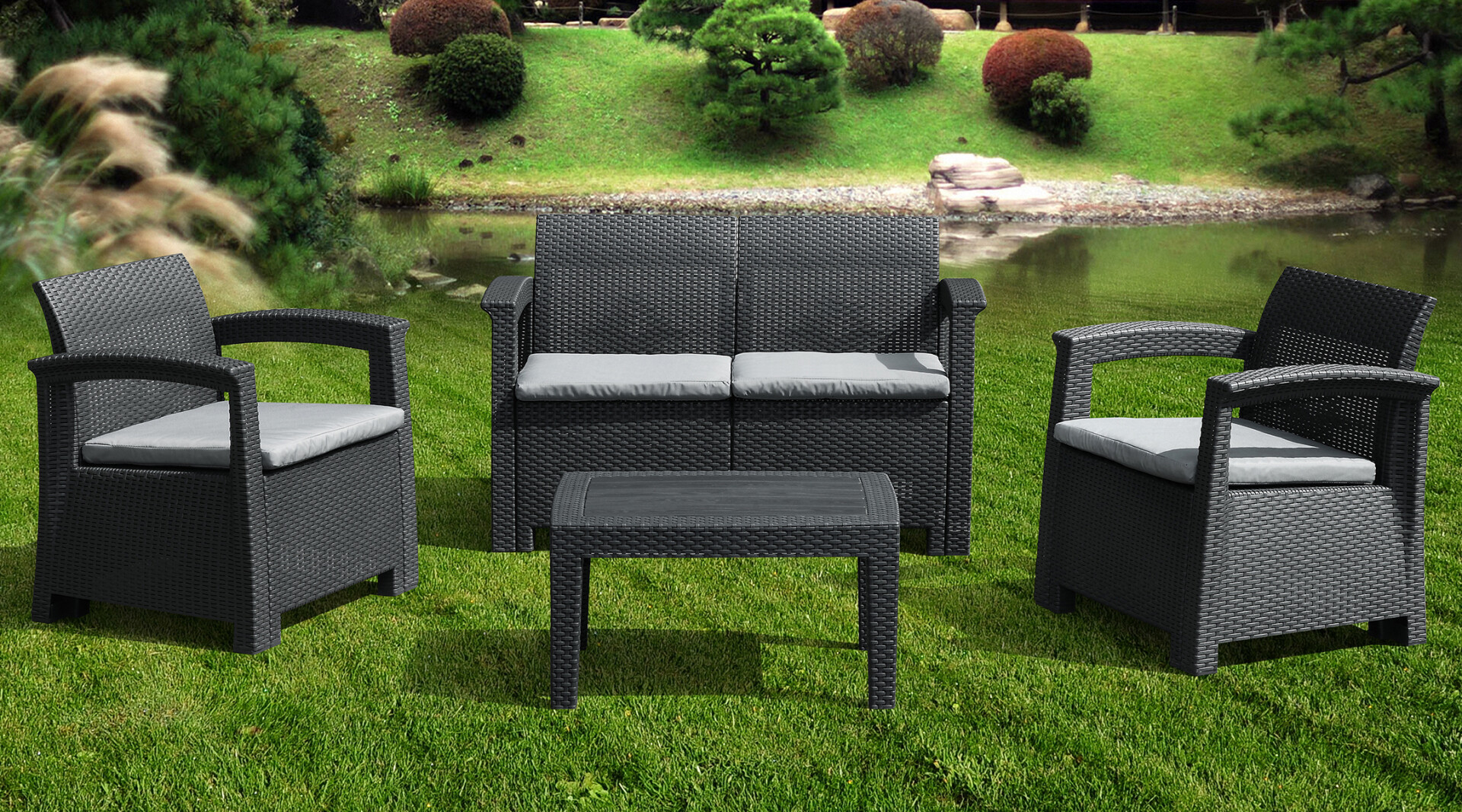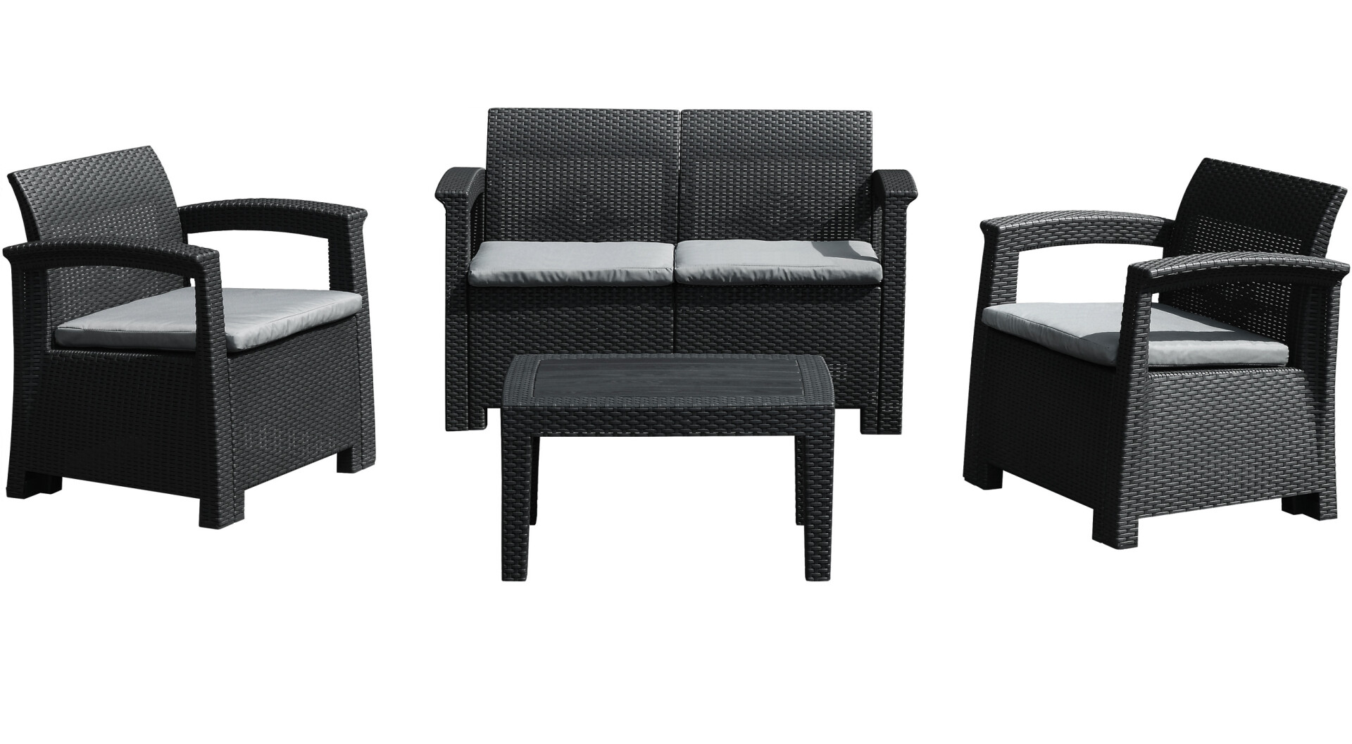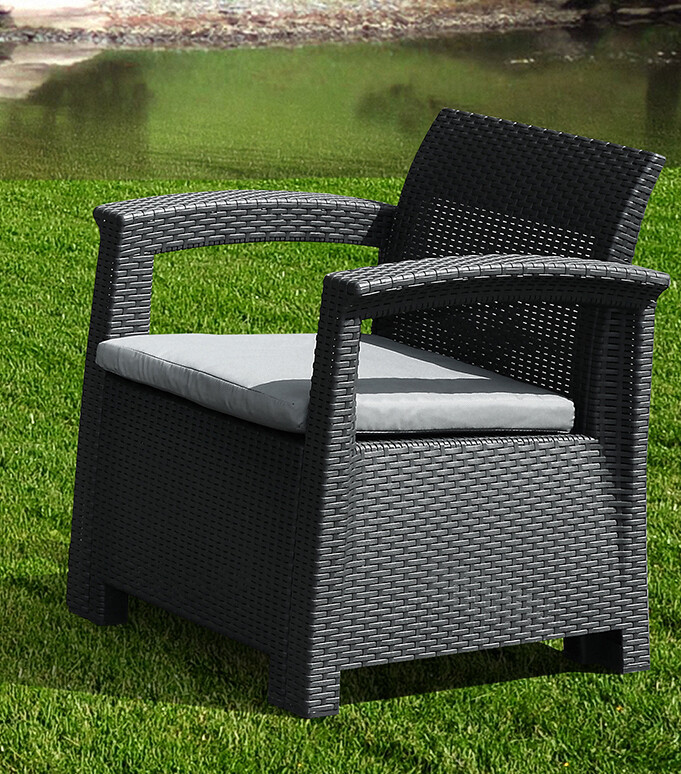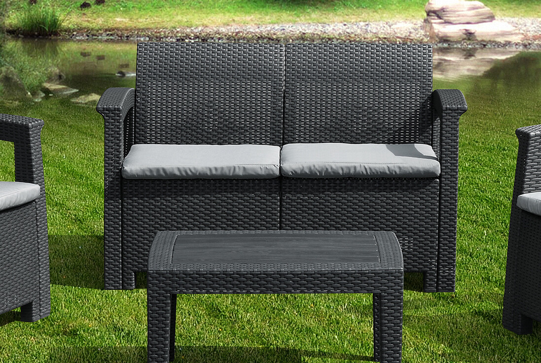Каждое кресло и диван оснащены мягкими, толстыми подушками для сиденья, которые гарантируют максимальный комфорт при длительном отдыхе. Прямые линии и качественное плетение ротанга придают комплекту современный, но в то же время уютный вид, легко вписывающийся в любой ландшафтный дизайн.