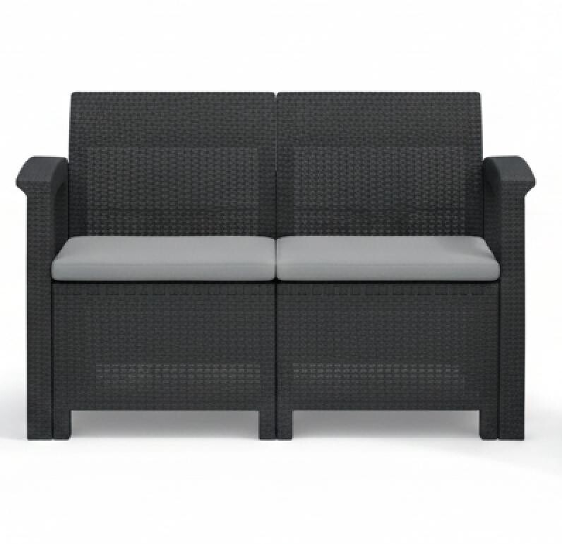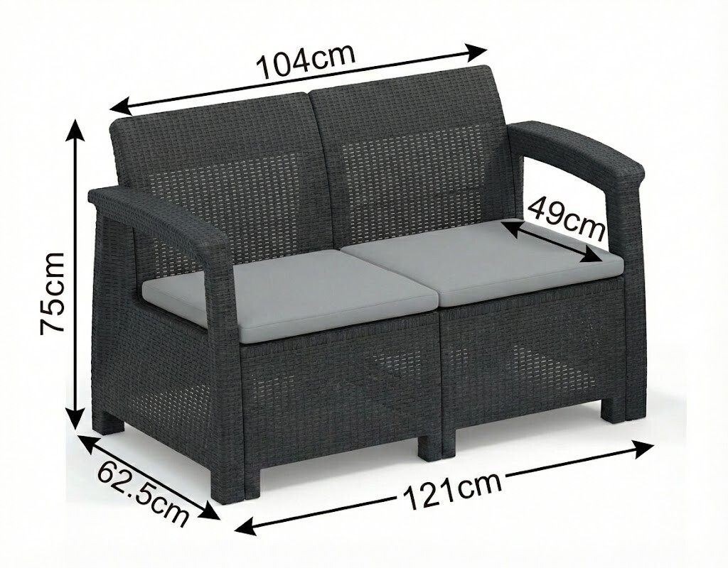 Каждое кресло и диван оснащены мягкими, толстыми подушками для сиденья, которые гарантируют максимальный комфорт при длительном отдыхе. Прямые линии и качественное плетение ротанга придают комплекту современный, но в то же время уютный вид, легко вписывающийся в любой ландшафтный дизайн.