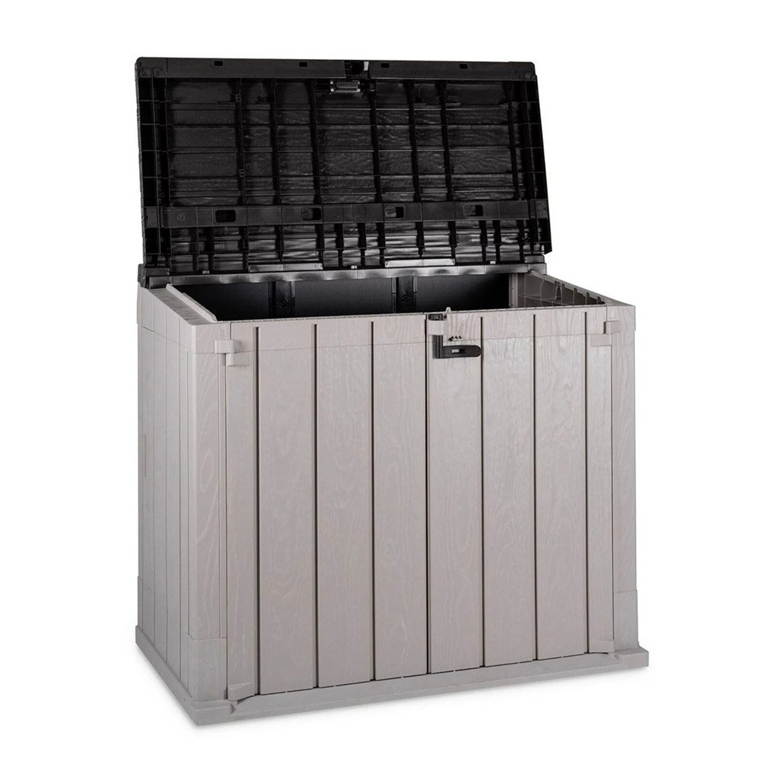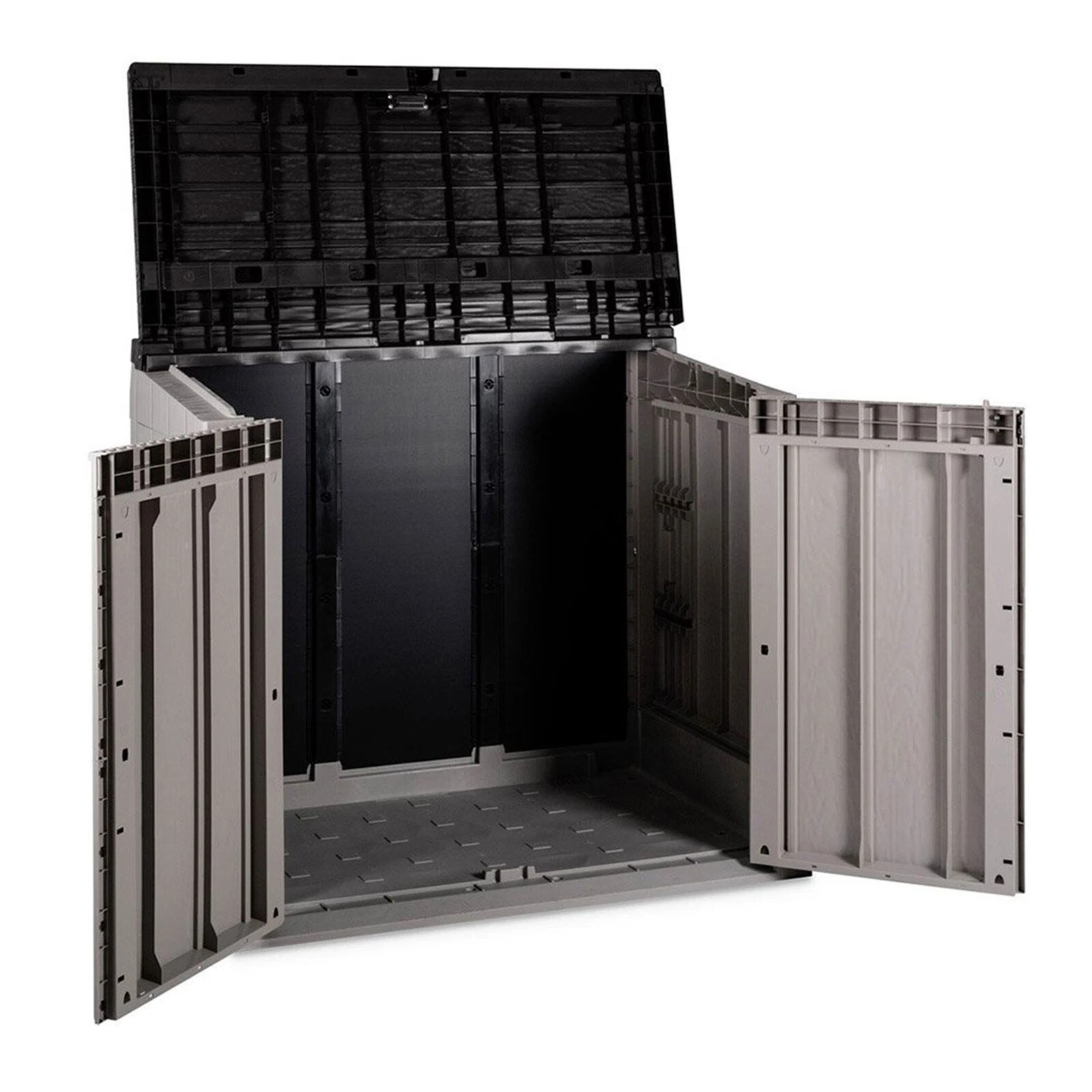 Прочный хозяйственный шкаф для сада выполнен из экологически чистого пластика с фактурой под дерево. Конструкция с откидной верхней крышкой, а также запирающимися дверцами. Благодаря этому низкий садовый шкаф для инвентаря подходит даже для использования в доме или гараже. Надежный стальной каркас шкафа выдерживает значительную нагрузку. В нижней части предусмотрен слив для дождевой воды. Садовый шкаф для мусорных баков выдерживает перепады температур, цвет не выгорает на солнце.