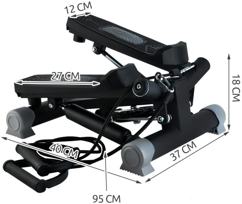 Дополнительно прикрепленные веревки с ручками позволяют одновременно тренировать руки. Полный комплекс тренировок гарантирует развитие не только рук и ног, но и всего тела за счет объединения упражнений в положении стоя и активации мышц, расположенных в других частях тела. Тренажер имеет регулируемую высоту ступеньки, что сказывается на сложности тренировки. Кроме того, благодаря шагам, движущимся по диагонали, вся тренировка становится еще более эффективной. Прочная конструкция степпера и специальные нескользящие ножки обеспечивают динамичные движения, а расширенные внизу резиновые ножки гарантируют безопасность и устойчивость.